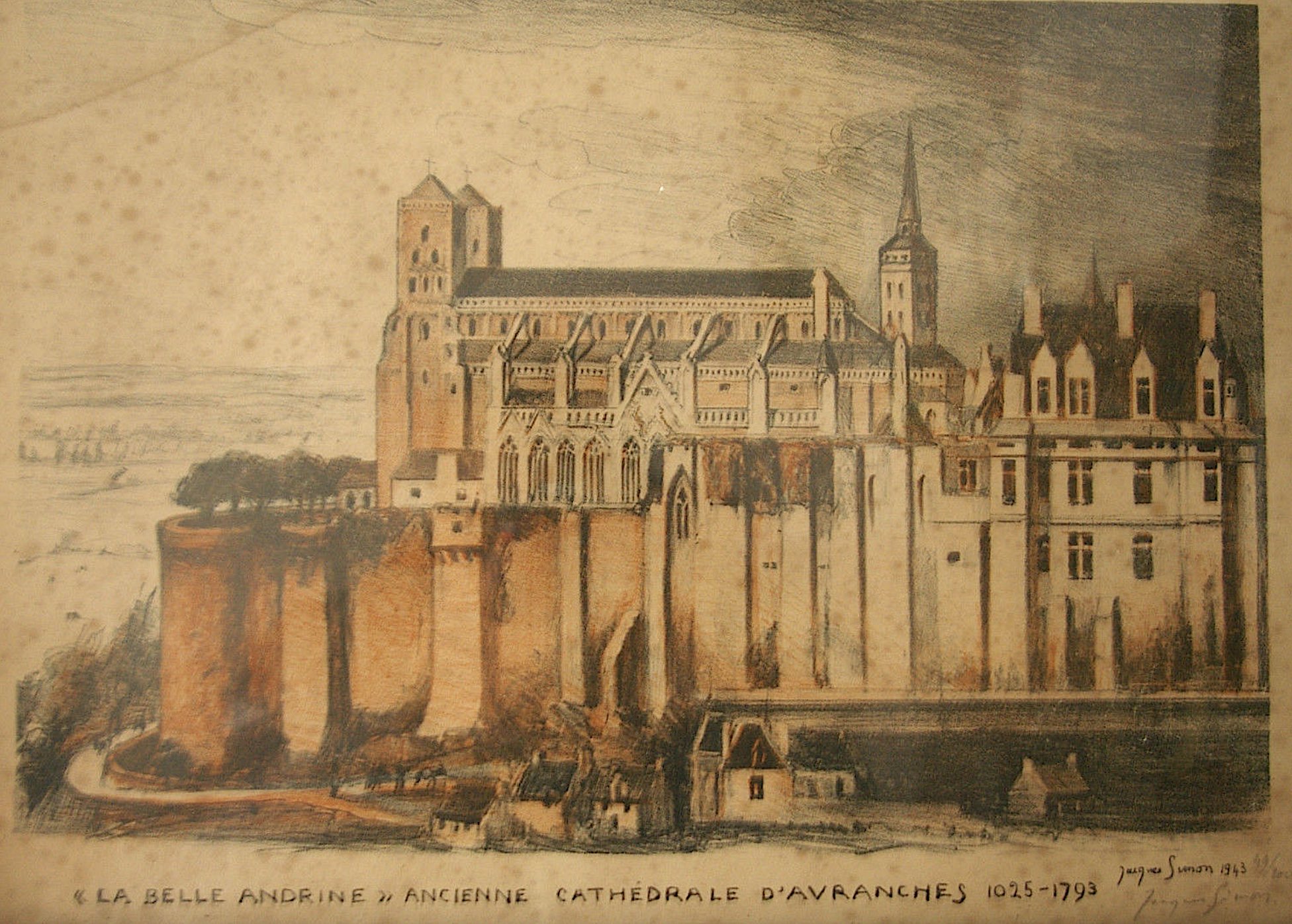 La « Belle Andrine », ancienne cathédrale d’Avranches, d’après un dessin du XVIIIe siècle, par Jacques Simon, 1943, n° 49 / 100.