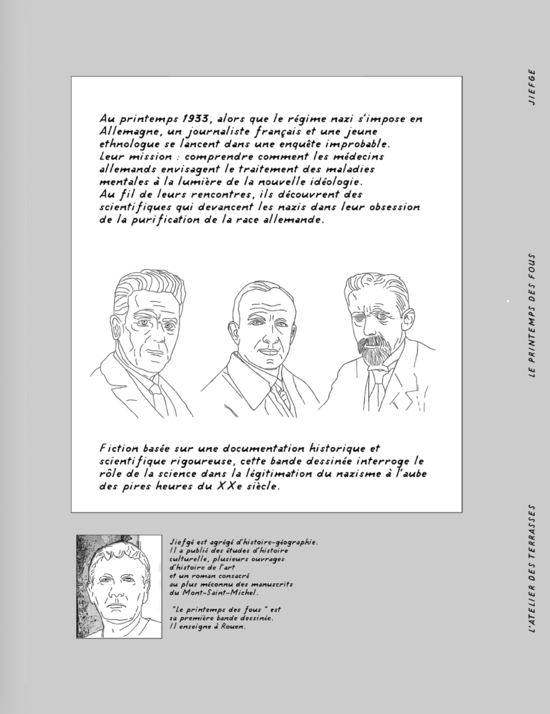 Fiction basée sur une documentation historique et scientifique rigoureuse, cette bande dessinée interroge le rôle de la science dans la légitimation du nazisme à l’aube des pires heures du XXe siècle.