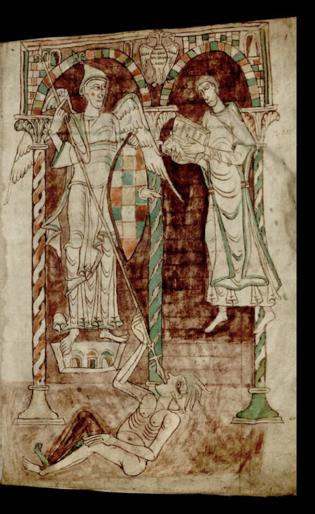 Une des plus anciennes représentations du combat de l’archange se trouve dans un manuscrit du Mont Saint-Michel (ms 50, feuillet 1 / recto, conservé au Scriptorial d’Avranches) : elle est étonnante.