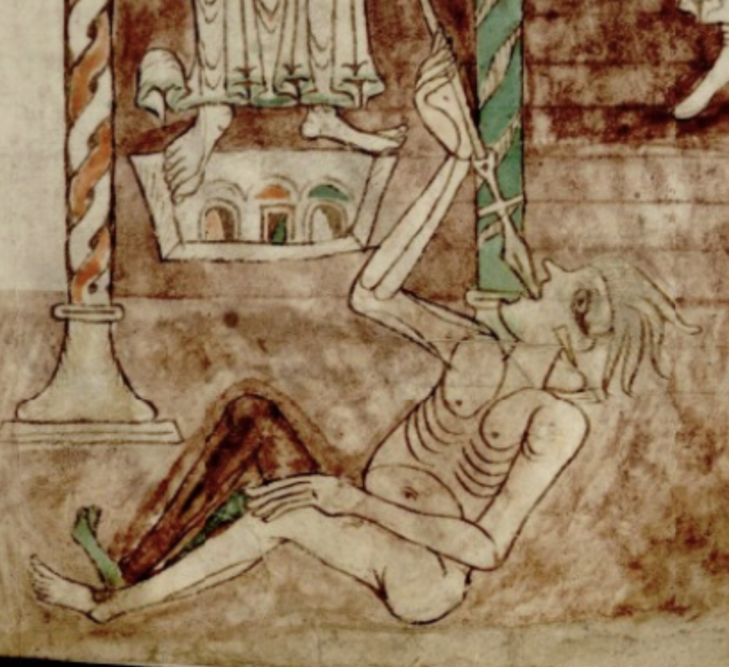 Cependant l’attitude du « démon » pose question. Il semble s’introduire lui-même la lance dans la gorge tandis que Michel, assez peu concerné par ce combat, tourne les yeux vers le moine Gelduin, comme si son livre importait plus que l’issue du combat, ou peut-être comme si ce livre en était la clé ? Faisons alors l’hypothèse que le contenu du manuscrit (Les Recognitiones de saint Clément) peut nous aider à comprendre l’enjeu de ce moment.